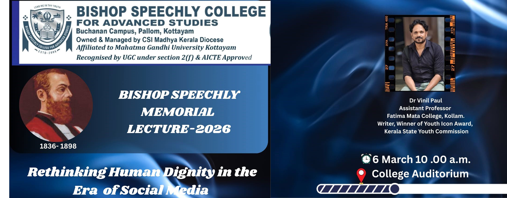 Speechly Memorial Lecture 2026 will be on 06th of march 2026. This year we have a special guest who is a well known writer and winner of Youth Ikon Award by Kerala Youth Commission, Dr.Vinil Paul, Assistant Professor,Fathima Matha College, Kollam.